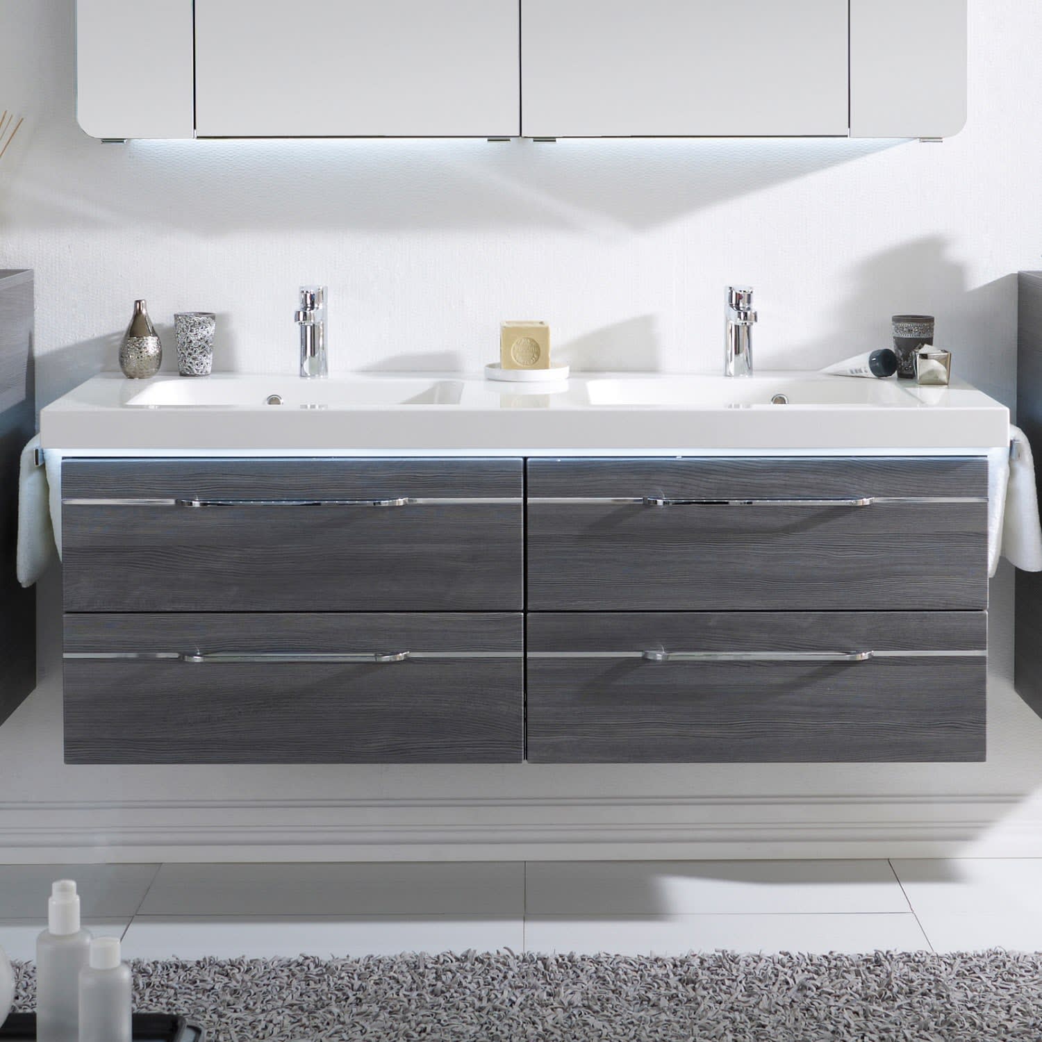 Pelipal Balto Waschtischkombination mit Mineralmarmor Doppelwaschtisch 148,2 cm, Griff Z1, LED-Zusatzbeleuchtung