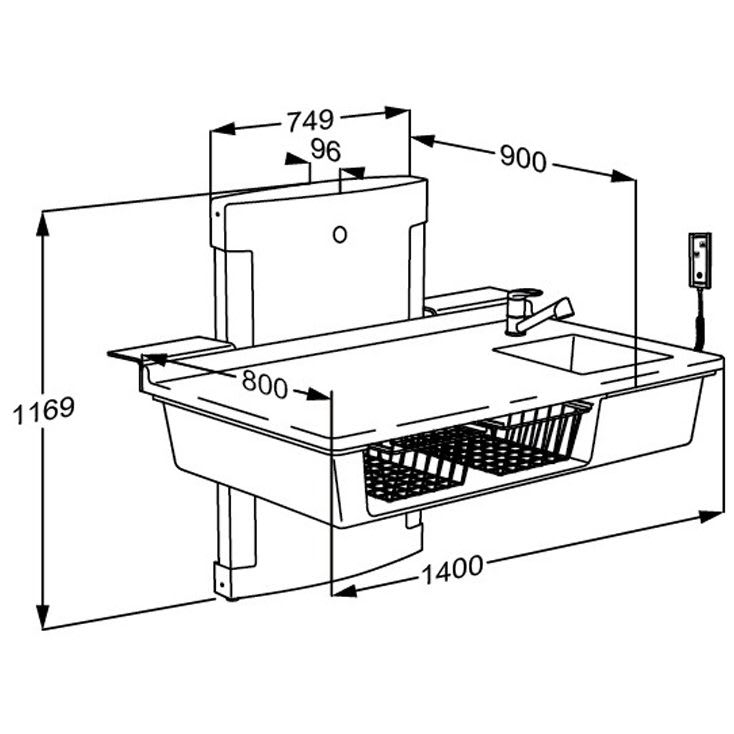 - Arbeitsplatte mit integriertem Waschtisch, hebelbetätigte Armatur mit schwenkbarem Wasserhahn und Ausziehbrause, Zu- und Ablaufsystem und 2 Drahtkörbe.