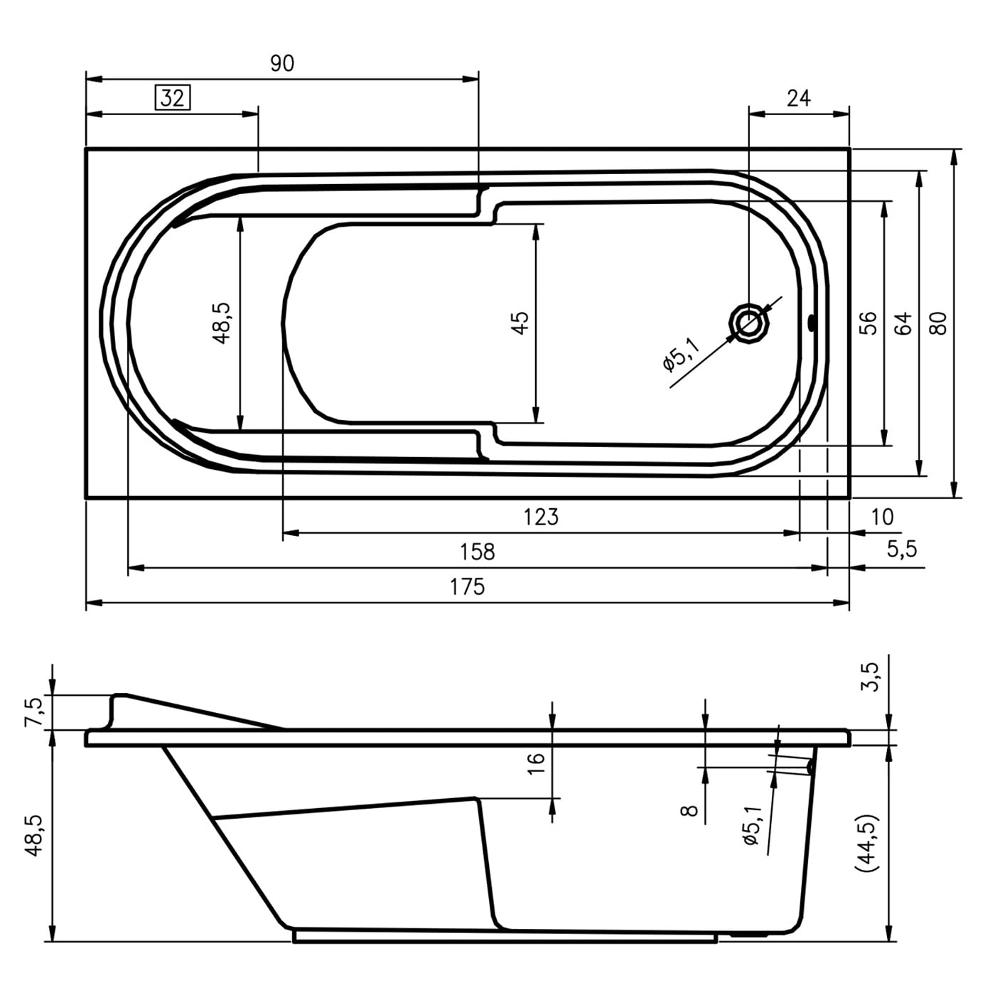 L: 175 B: 80 H: 48,5 cm