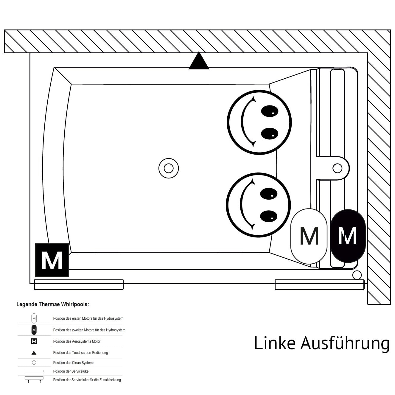 - 3 x Maxi Hydrodüsen SPA rotierend (Einsatz im Rückenbereich, sehr leistungssarker Massageffekt, Strahlrichtung individuell einstellbar)