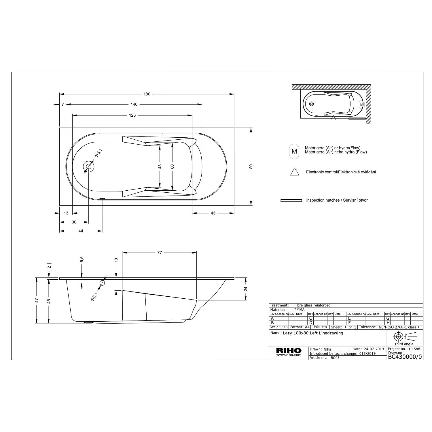 Riho Lazy Whirlpool 180 x 80 cm Air, Ablauf links