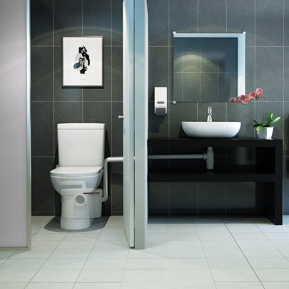 - Nach jedem Spülvorgang werden organische Stoffe und Papier verflüssigt und automatisch abgepumpt. Die Abwässer können mit dem Sanibroy Saniaccess 2 bis zu 5 m hoch bzw. 90 m weit zum Abwasserkanal gefördert werden. Die Abwasser-Druckleitung mit einer geringen Größe von nur DN 25 - 32 kann man fast unsichtbar verlegen. Über den zusätzlichen Anschluss DN 40 wird mit dem Sanibroy Pro das Abwasser von Waschtisch und/oder Urinal in Sekundenschnelle Abgepumpt. Die Konstruktion vom Sanibroy Saniaccess 2 ermöglicht den Zugriff auf alle Bauteile, ohne das man das WC demontieren muss.