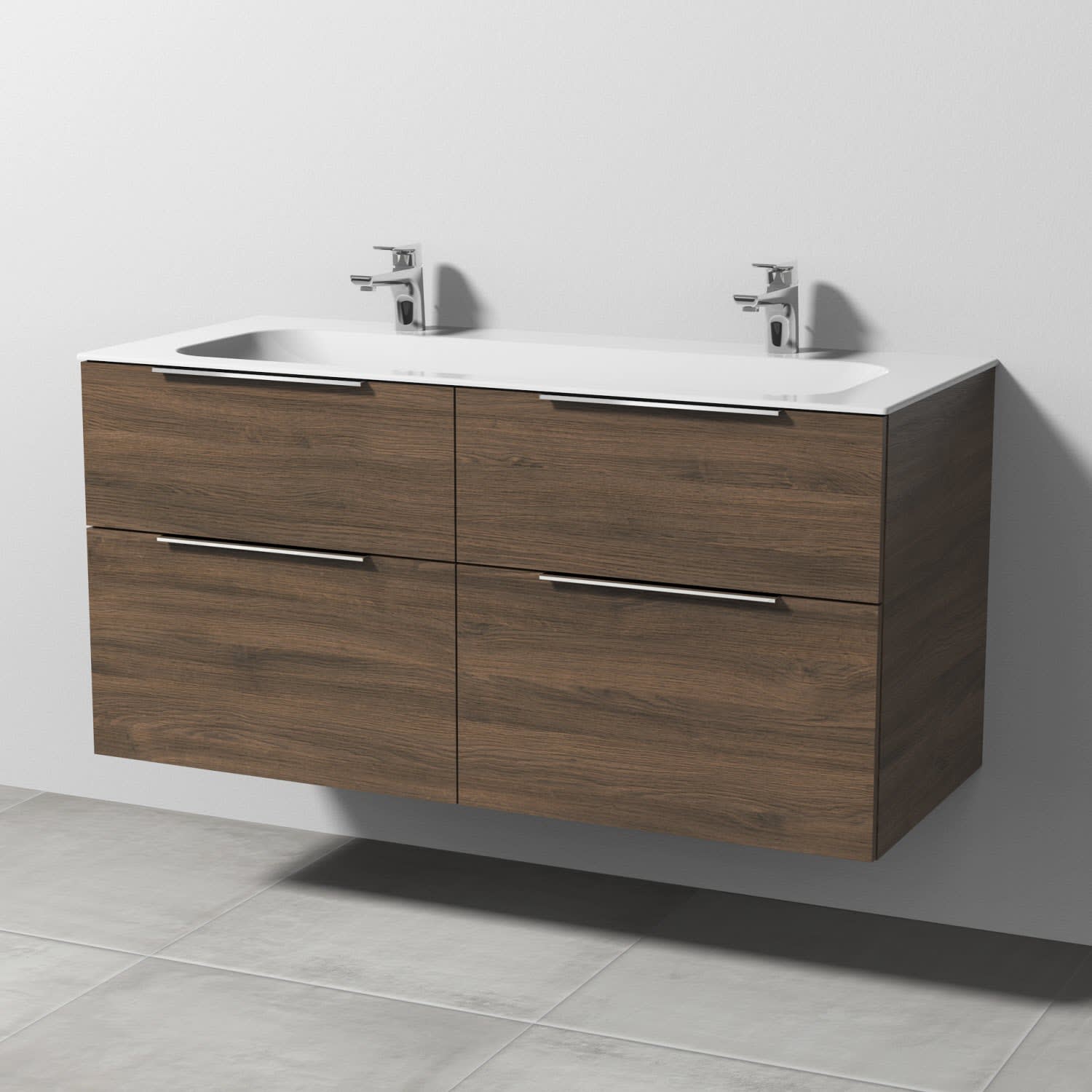 Sanipa 3way Unterschrank 120 cm, 4 Auszüge, Aufsatz-Griffe mit Villeroy & Boch Finion Doppelwaschtisch