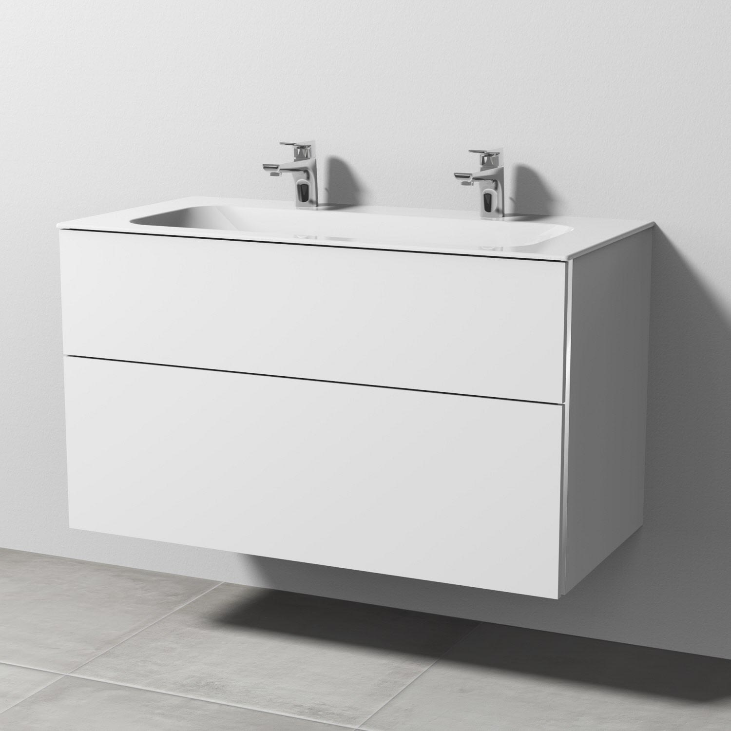 Sanipa 3way Unterschrank 100 cm, 2 Auszüge, Griff-Leisten mit Villeroy & Boch Finion Doppelwaschtisch