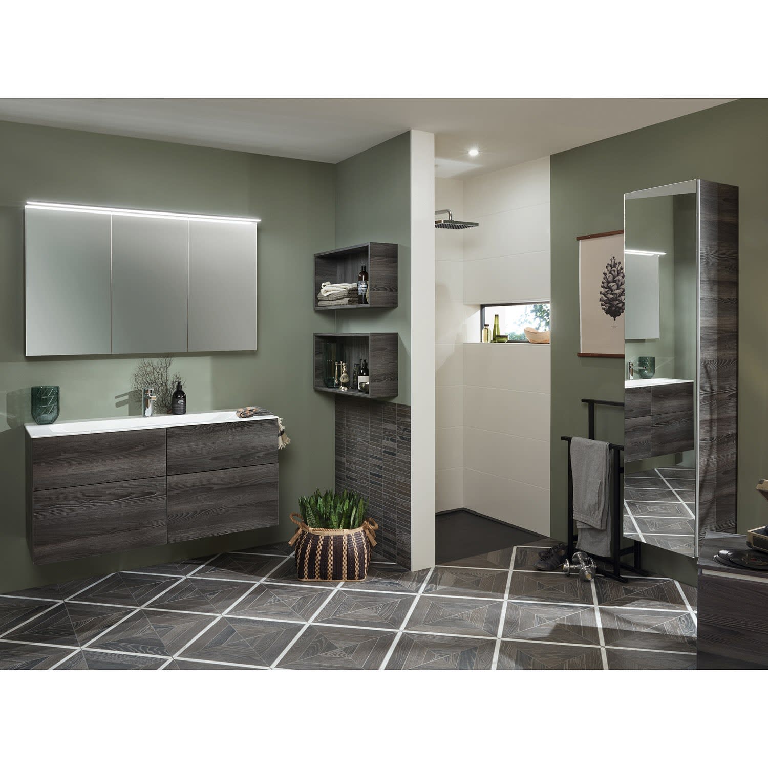 Sanipa 3way Unterschrank 120 cm, 4 Auszüge, Griff-Leisten mit Villeroy & Boch Finion Waschtisch