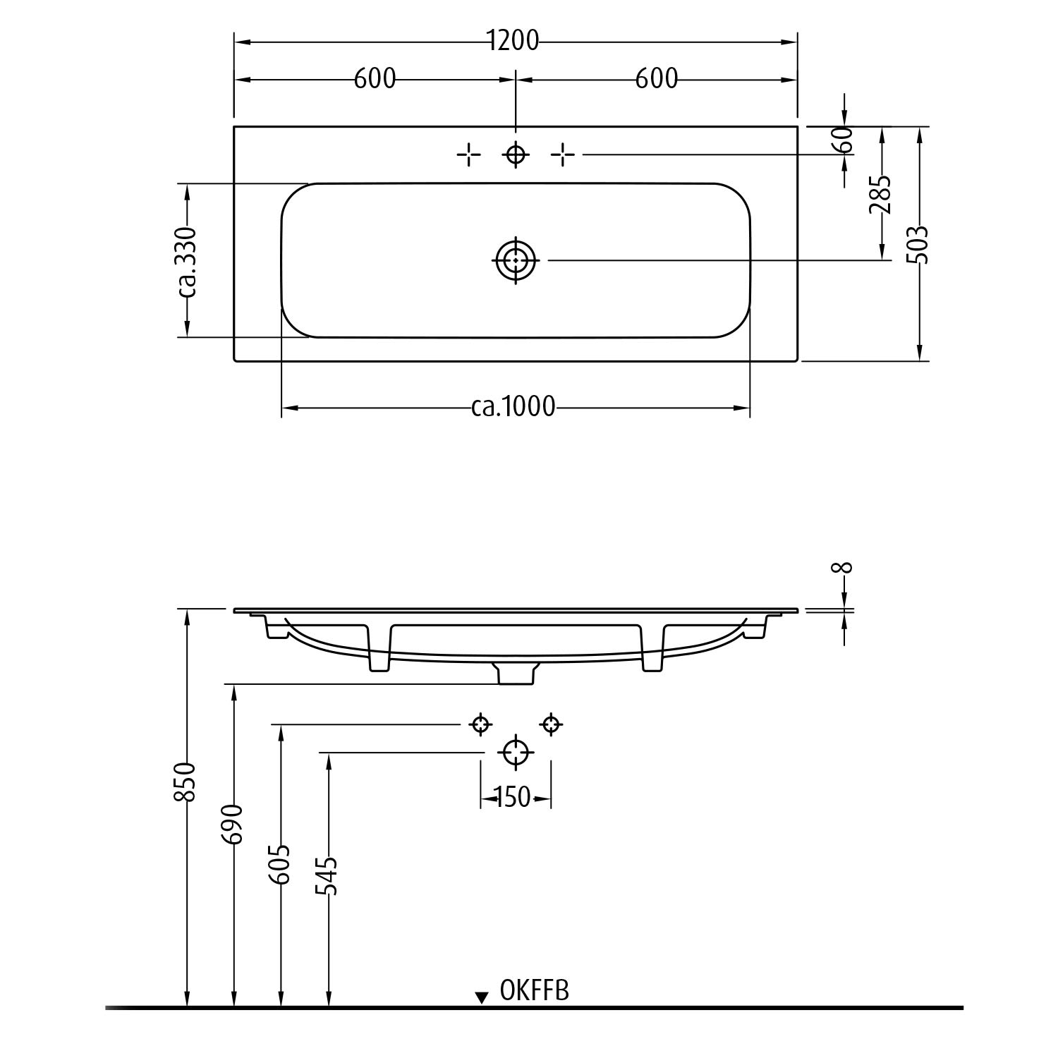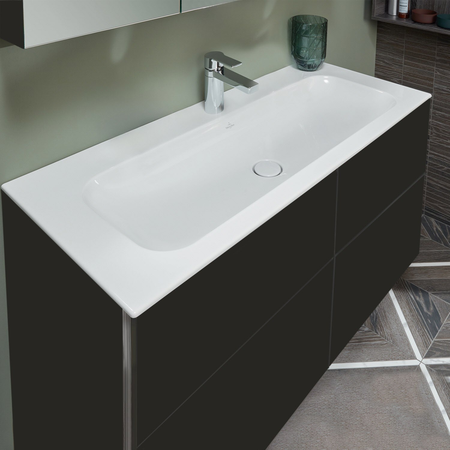 Sanipa 3way Unterschrank 120 cm, 4 Auszüge, Griff-Leisten mit Villeroy & Boch Finion Waschtisch