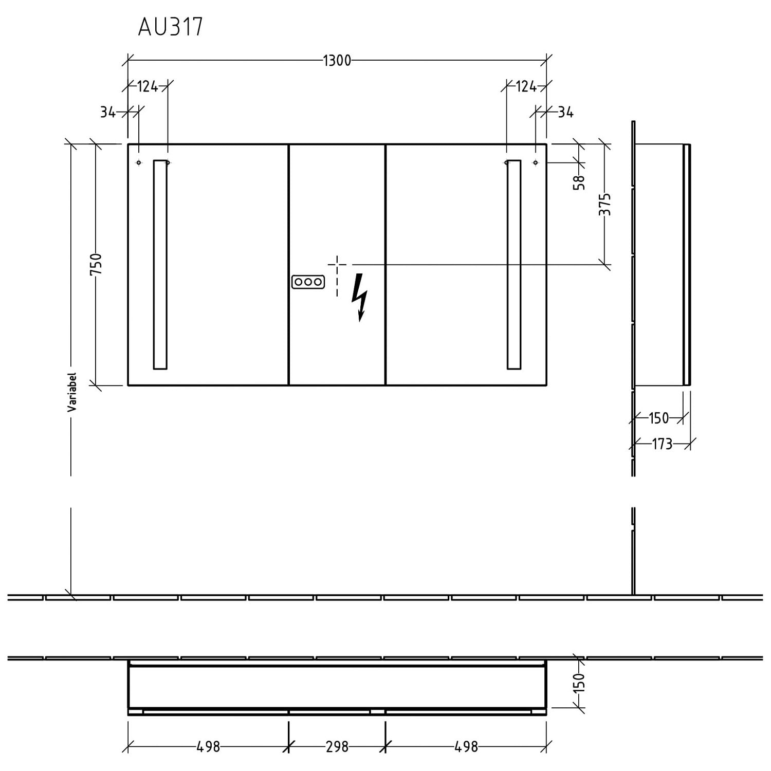 - Spiegeltürenbreite: 49,8 / 29,8 / 49,8 cm