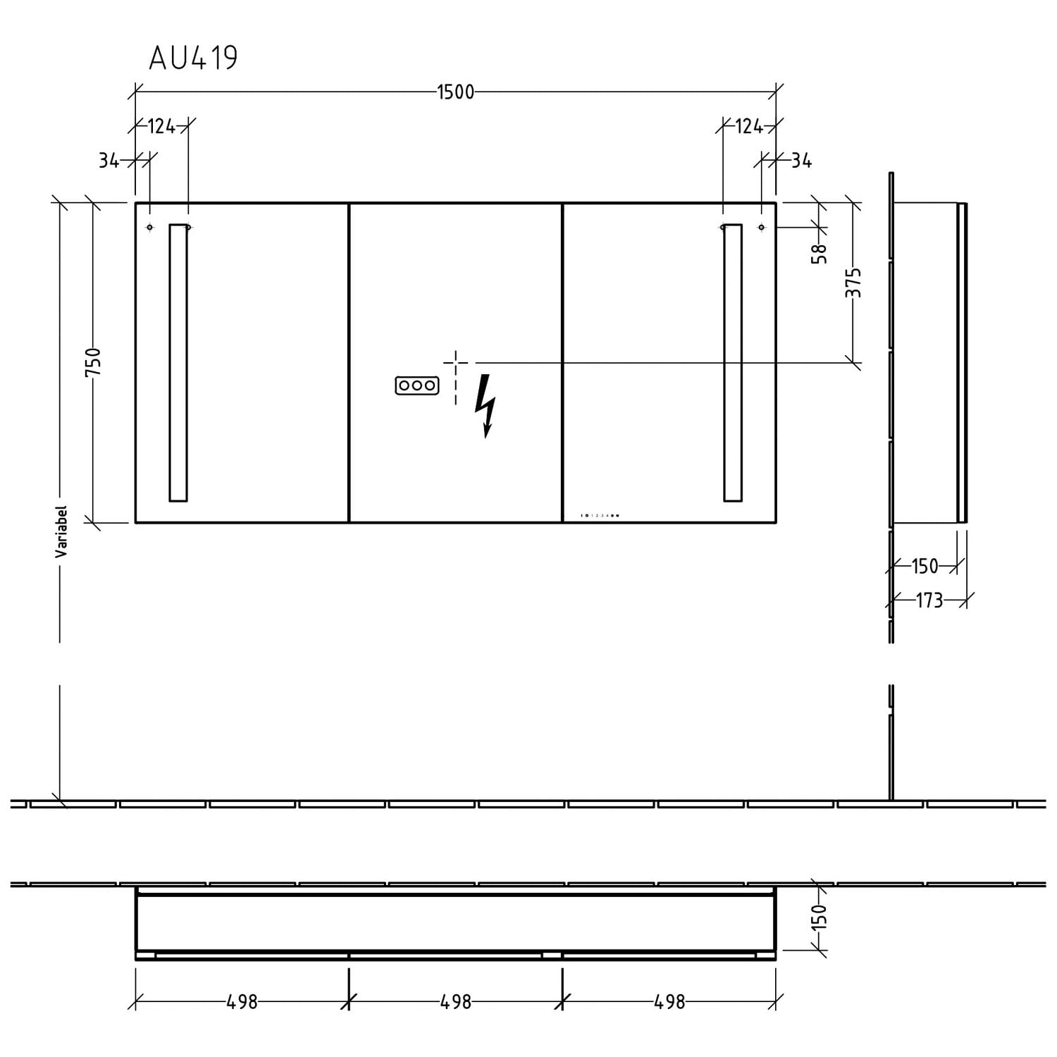 - Spiegeltürenbreite: 49,8 / 49,8 / 49,8 cm