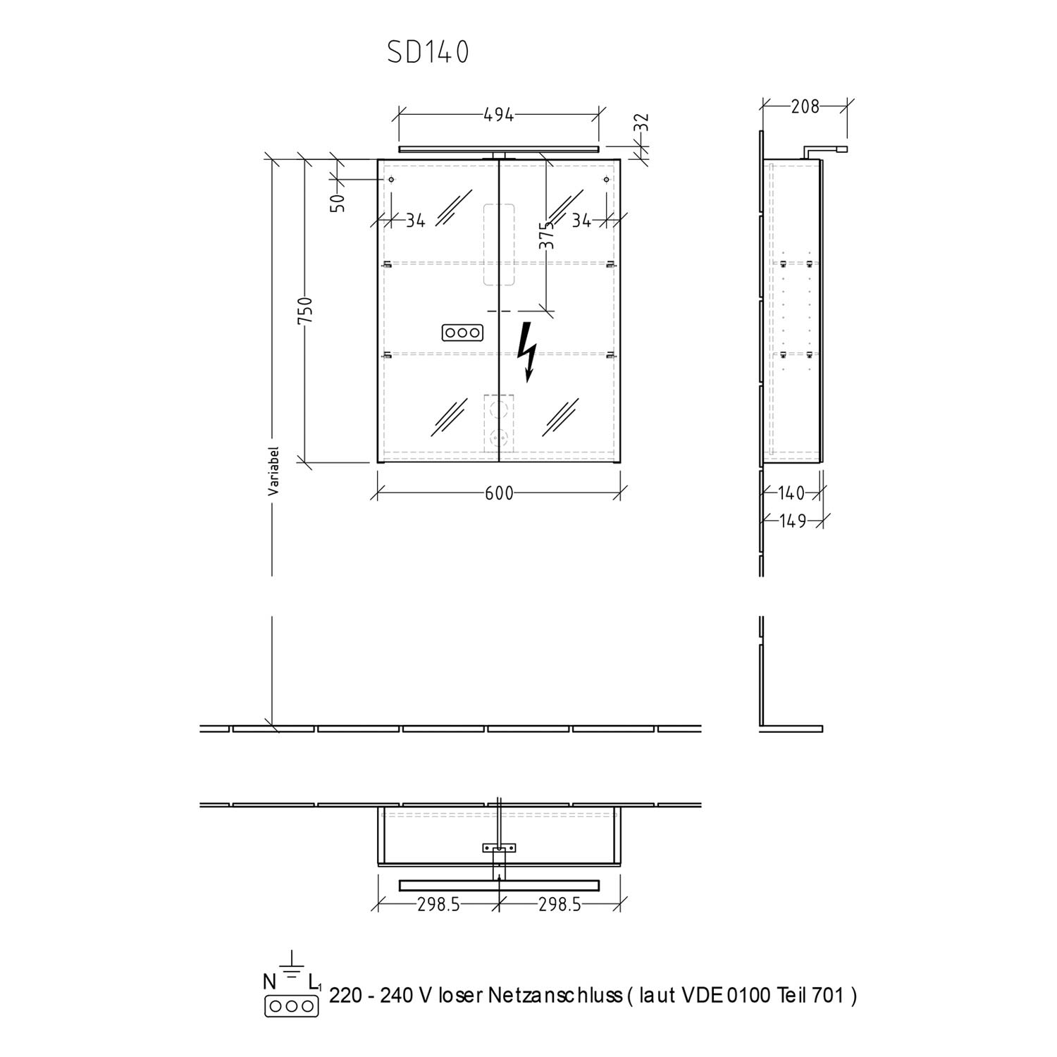 - 1 innenliegender Lichtschalter unten, mittig