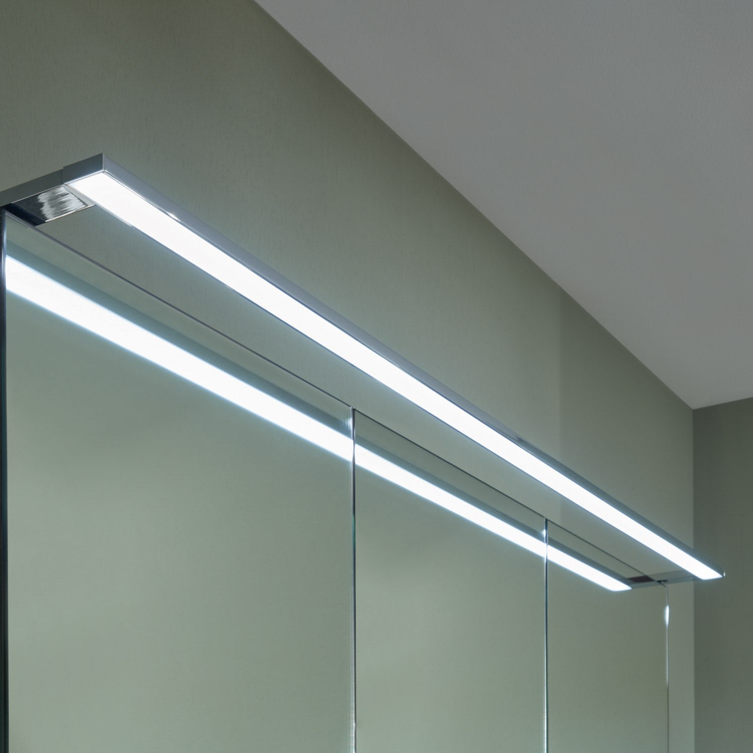 Die moderne LED-Aufsatzleuchte reicht über die ganze Breite und lässt sich
