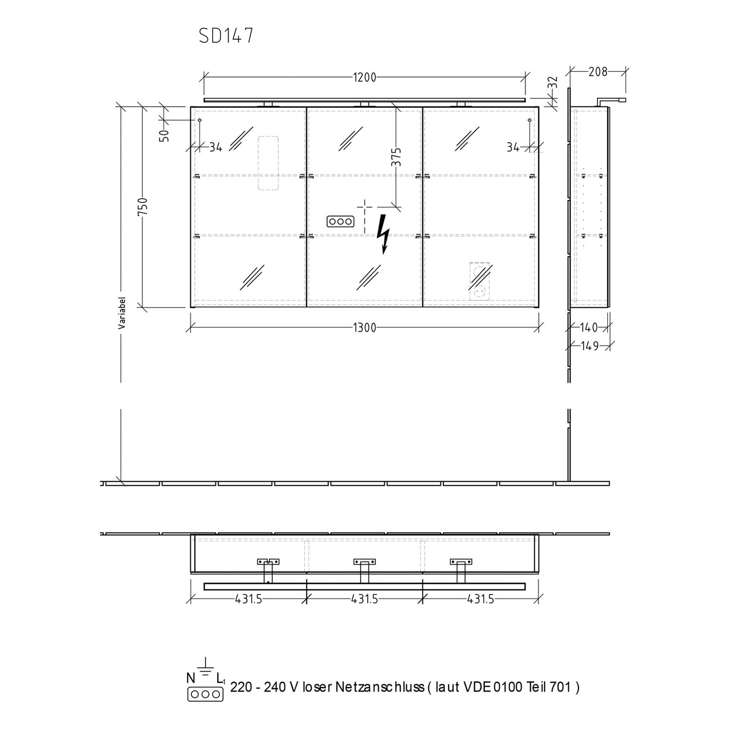 - Spiegeltürenbreite: 43,2 / 43,2 / 43,2 cm