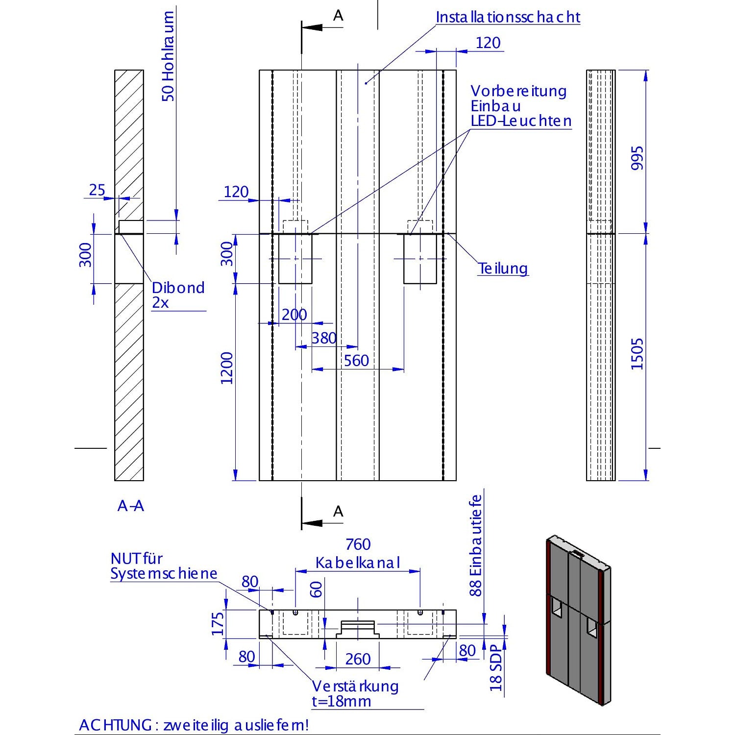 Schedel Wandmodul mit Installationsschacht, raumhoch für Duschplatz 250 x 120 x 17,5 cm