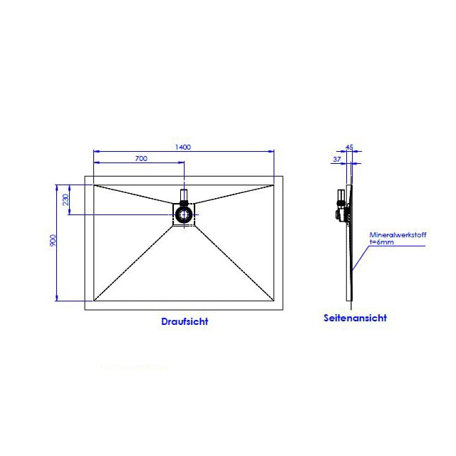 Schedel Plan Plus Mineral-Duschelement bodeneben 140 x 90 cm, Ablauf hinten mittig