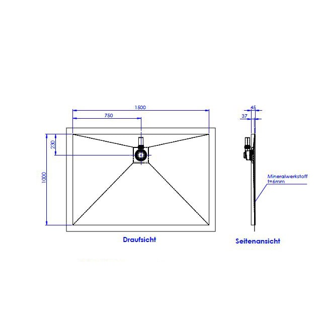 Schedel Plan Plus Mineral-Duschelement bodeneben 150 x 100 cm, Ablauf hinten mittig