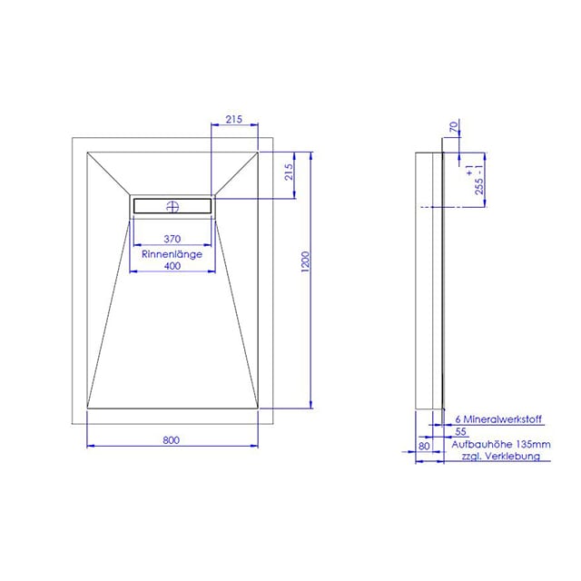 Schedel Plan Plus Mineral-Duschelement bodeneben 80 x 120 cm mit Rinne, Gefälle vierseitig
