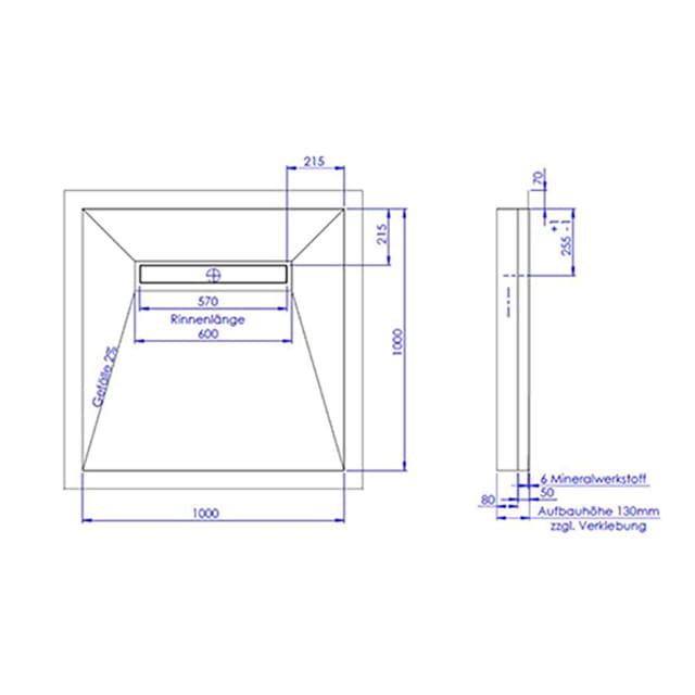 Schedel Plan Plus Mineral-Duschelement bodeneben 100 x 100 cm mit Rinne, Gefälle vierseitig