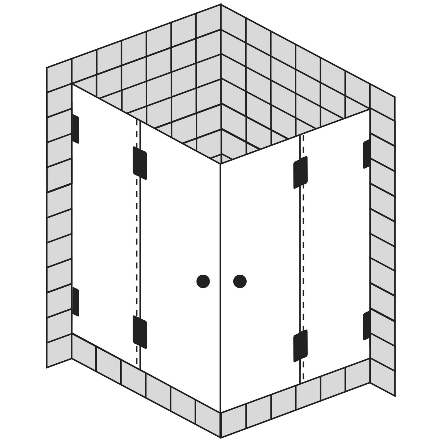 - 4-teilig mit 4 Drehtüren und 2 Festteilen (wandseitig)