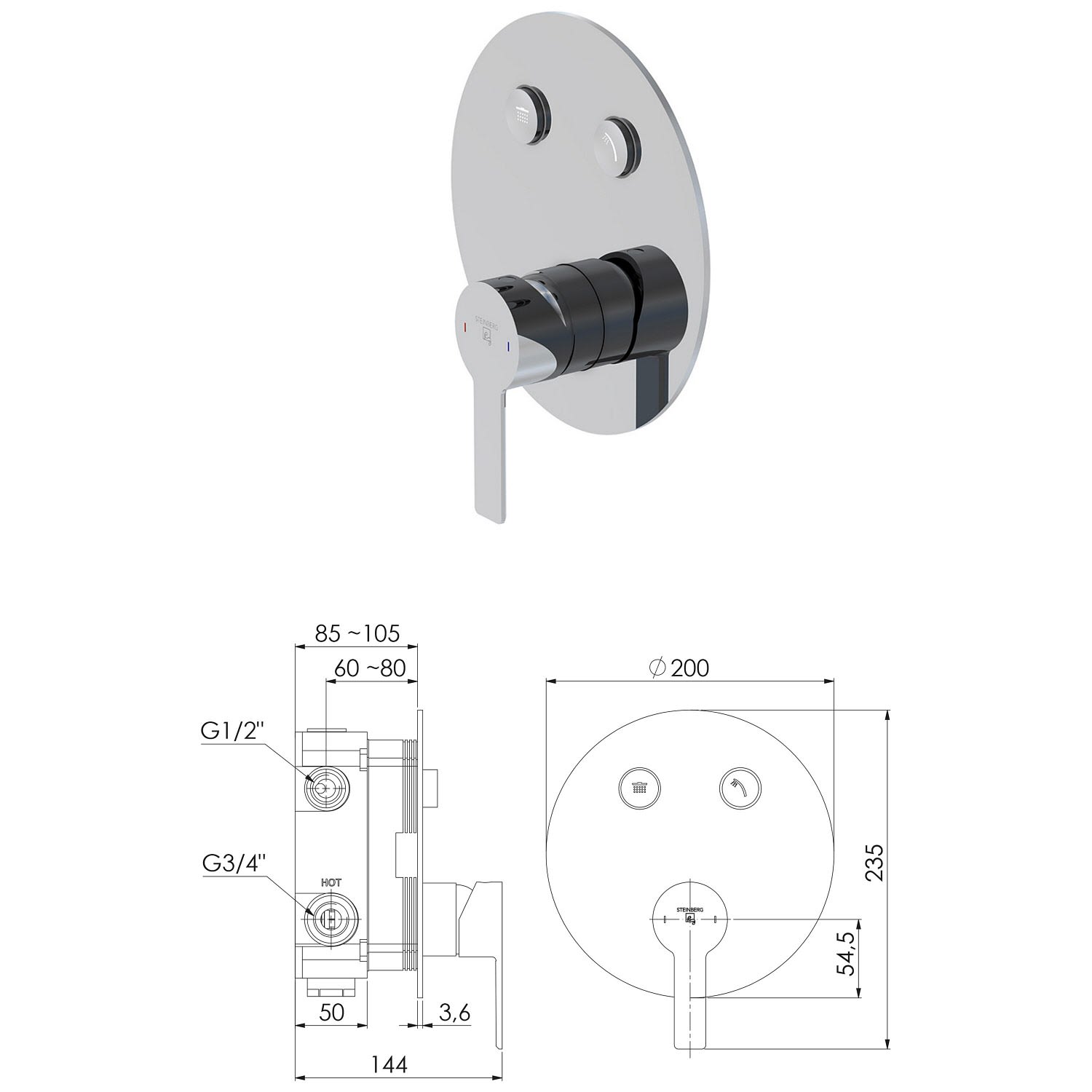 Steinberg Sensual Rain Pushtronic Set 1 rund, 2 Verbraucher, mit Regenbrause Ø 30 cm superflach