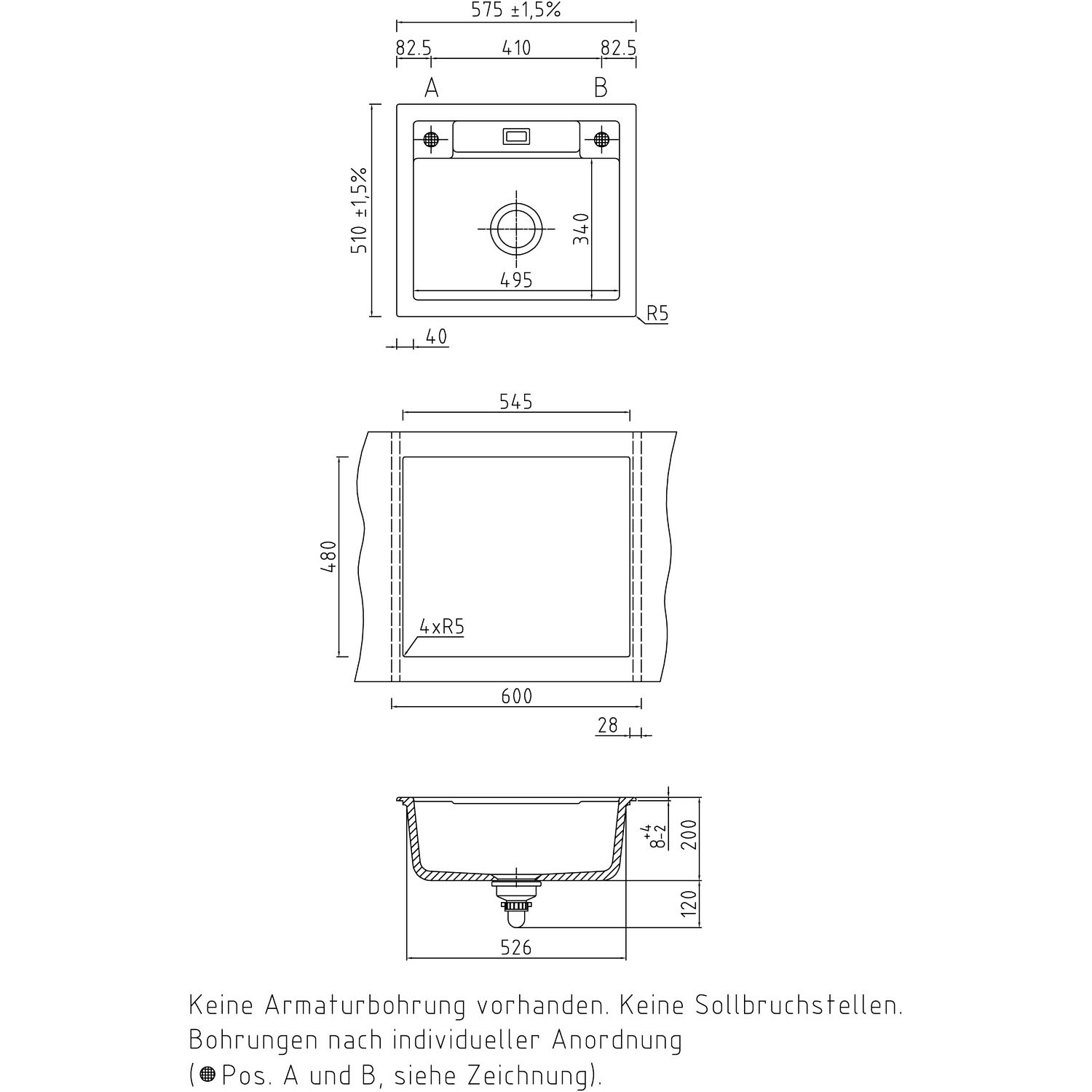 Für Hahnlochbohrungen muss der entsprechende Artikel aus dem Zubehör zusätzlich mitbestellt werden. Informationen zu den Positionen der möglichen Hahnlöcher befinden sich in der Technischen Zeichnung