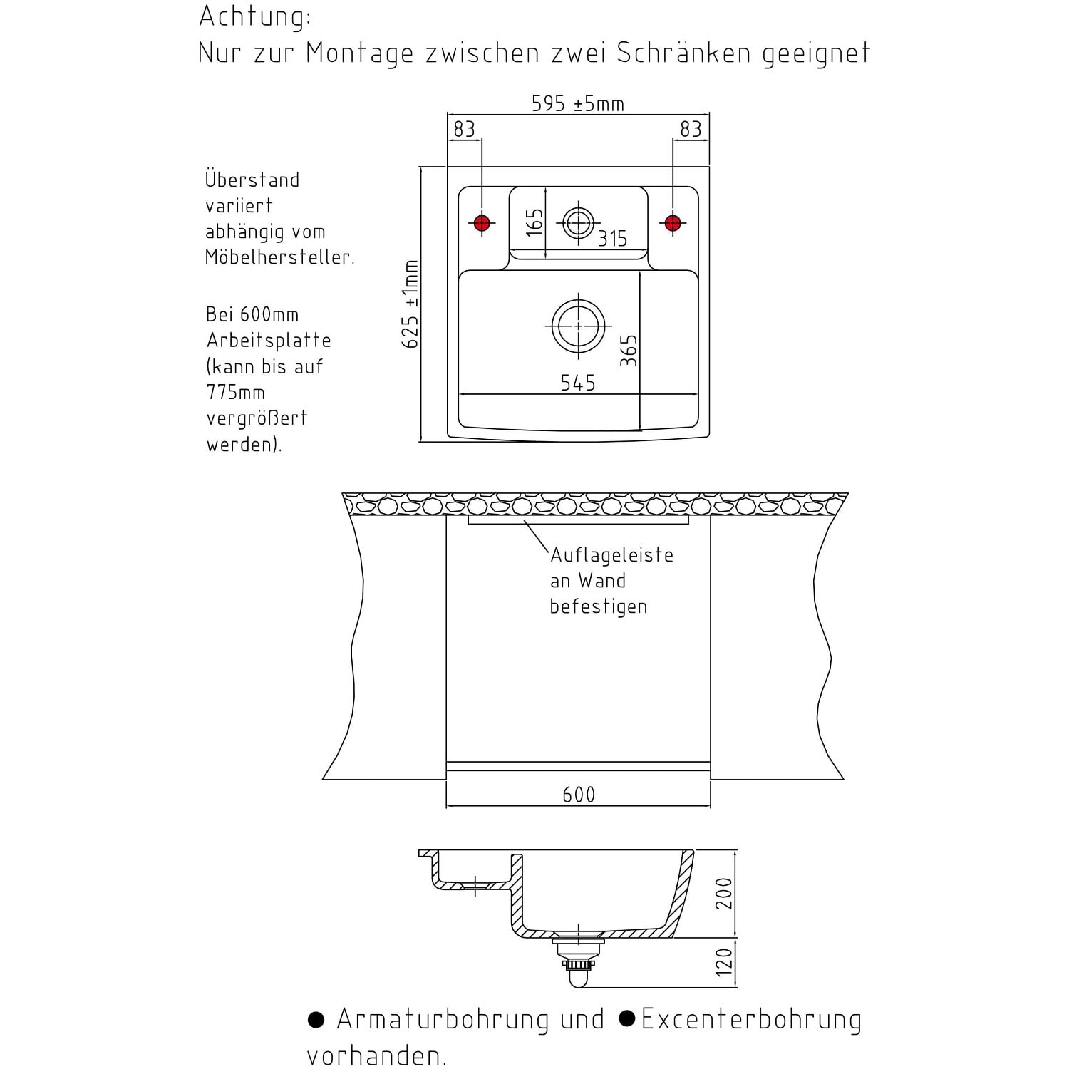 - mit Lochbohrungen für Armatur und Excenter