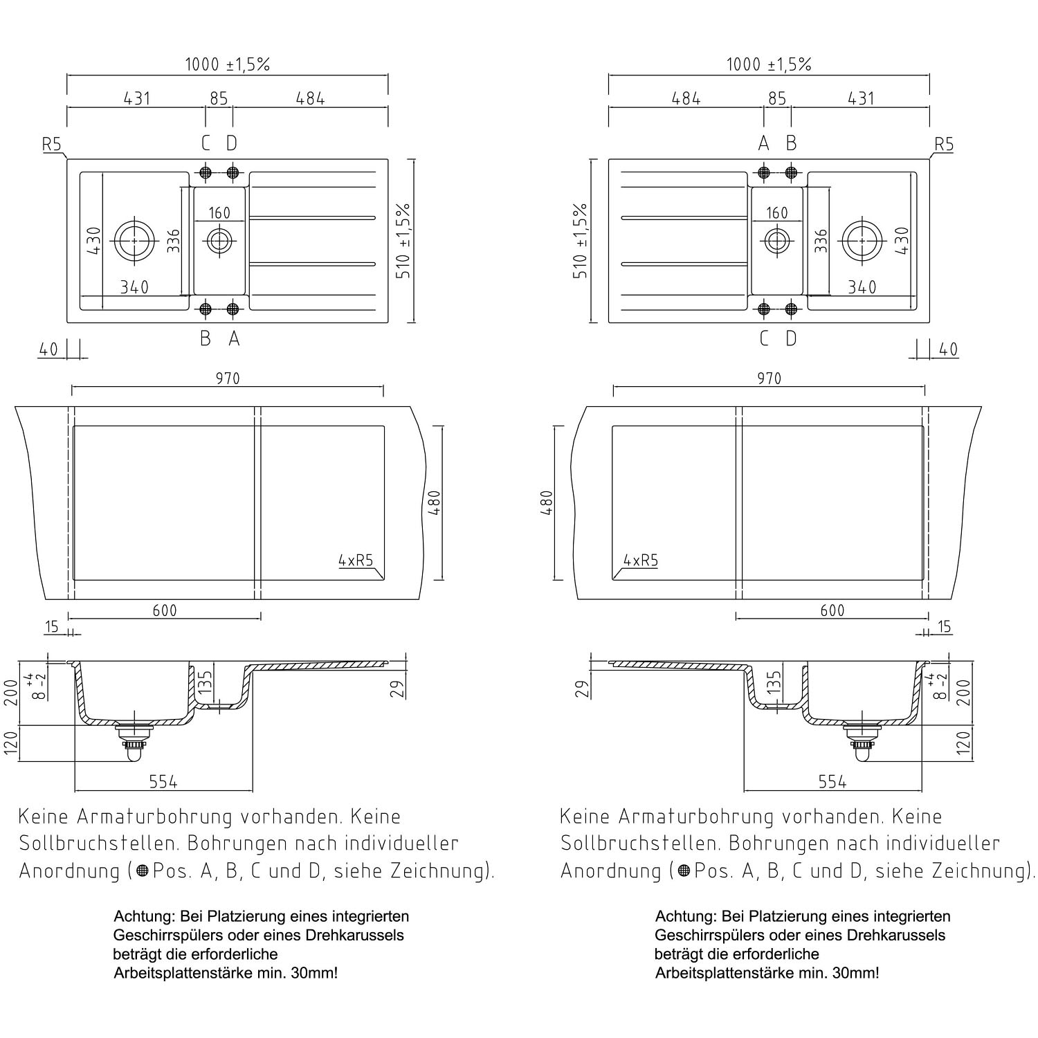 - Spüle ist reversiebel einsetzbar (Montage mit Becken links oder rechts möglich)