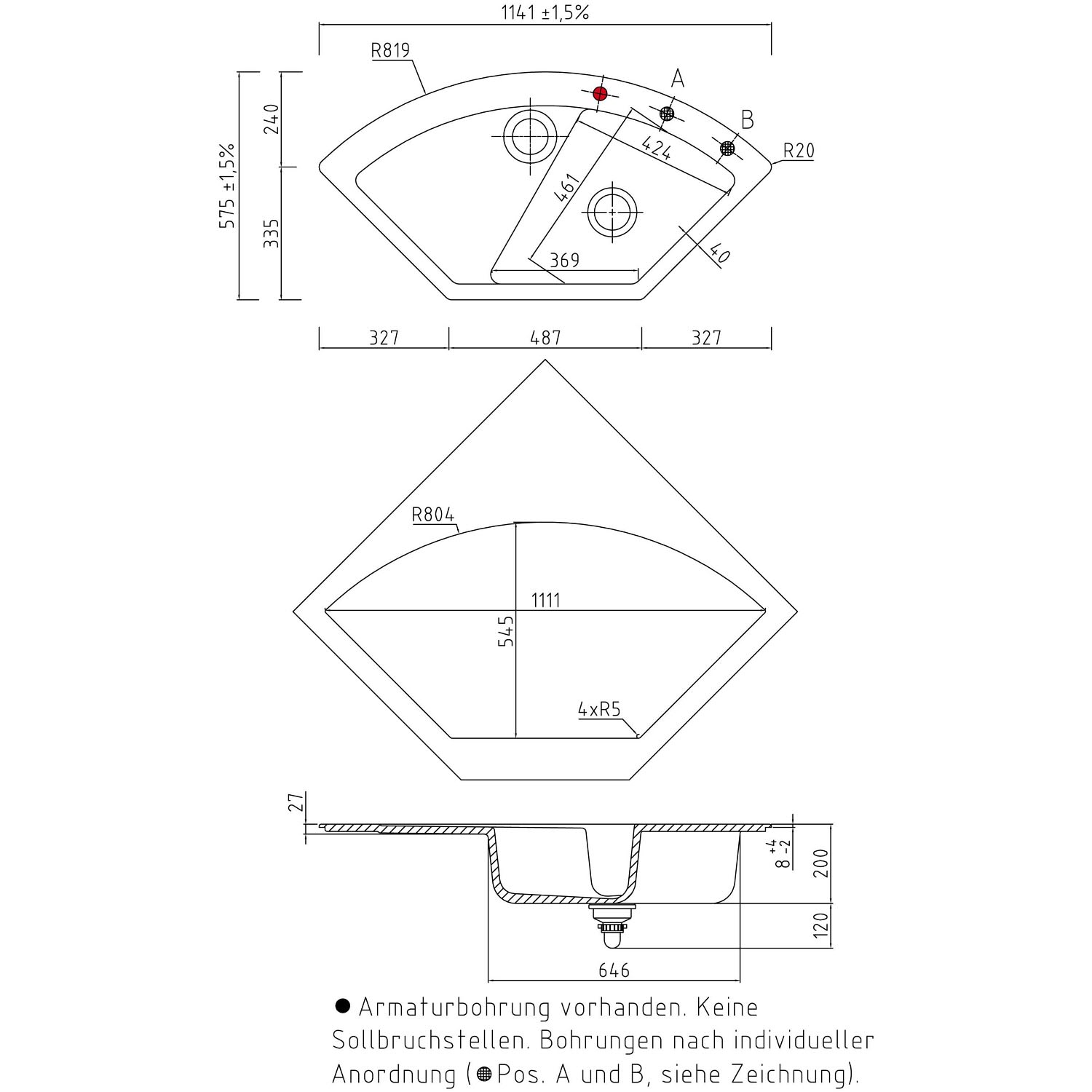 Für zusätzliche Bohrungen muss der entsprechende Artikel aus dem Zubehör zusätzlich mitbestellt werden. Informationen zu den Positionen der möglichen Hahnlöcher befinden sich in der Technischen Zeichnung