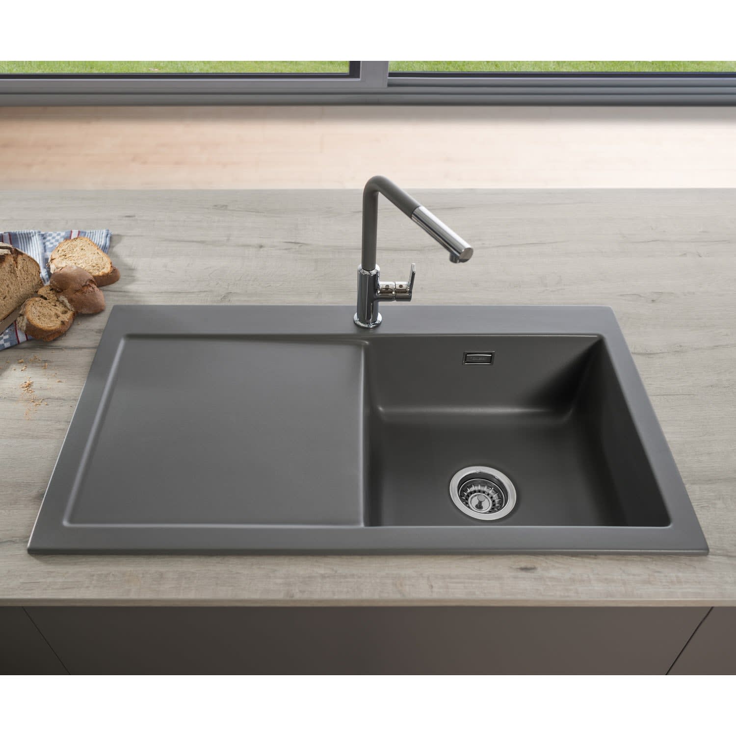 Systemceram Keradomo Mera 90 Einbauspüle rechts mit Handbetätigung, inkl. Armaturbohrung