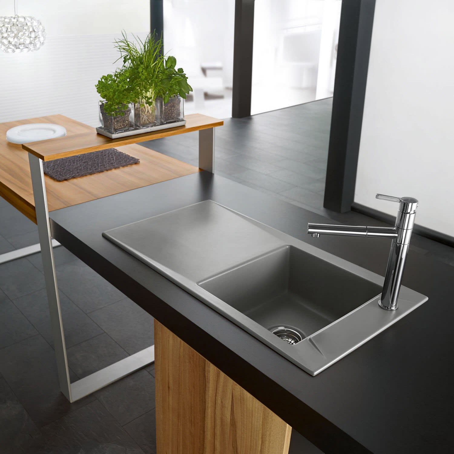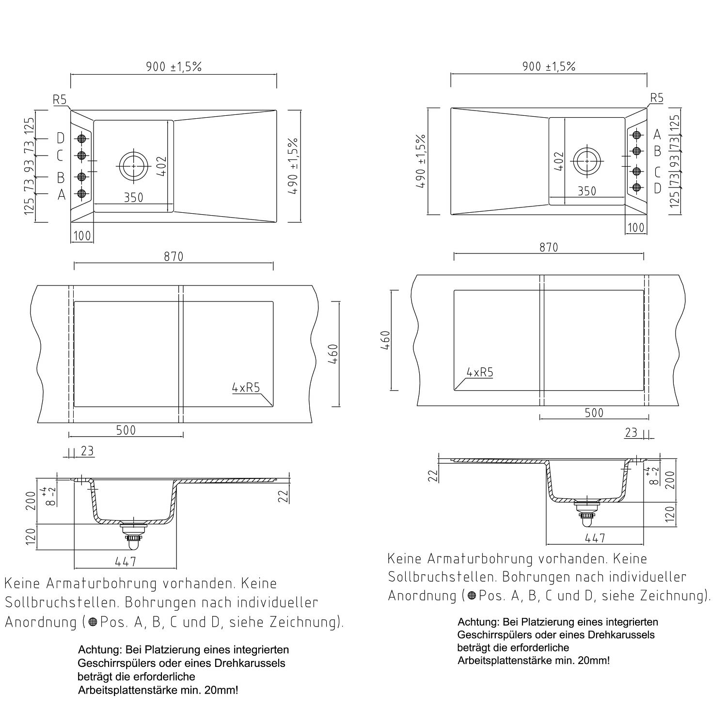 - Spüle ist reversibel einsetzbar (Montage mit Becken links oder rechts möglich)