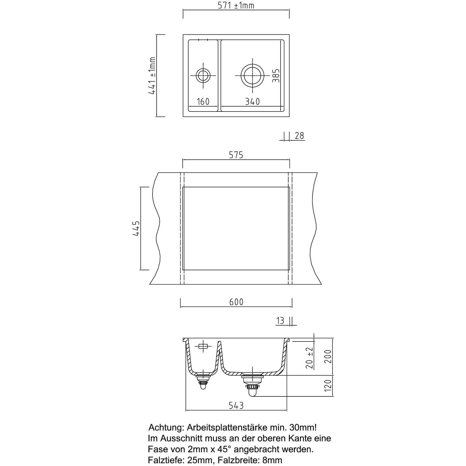 Systemceram Keradomo Mera 60 F/o Spüle für flächenbündigen Einbau mit Excenterbetätigung, ohne Hahnlochbohrung