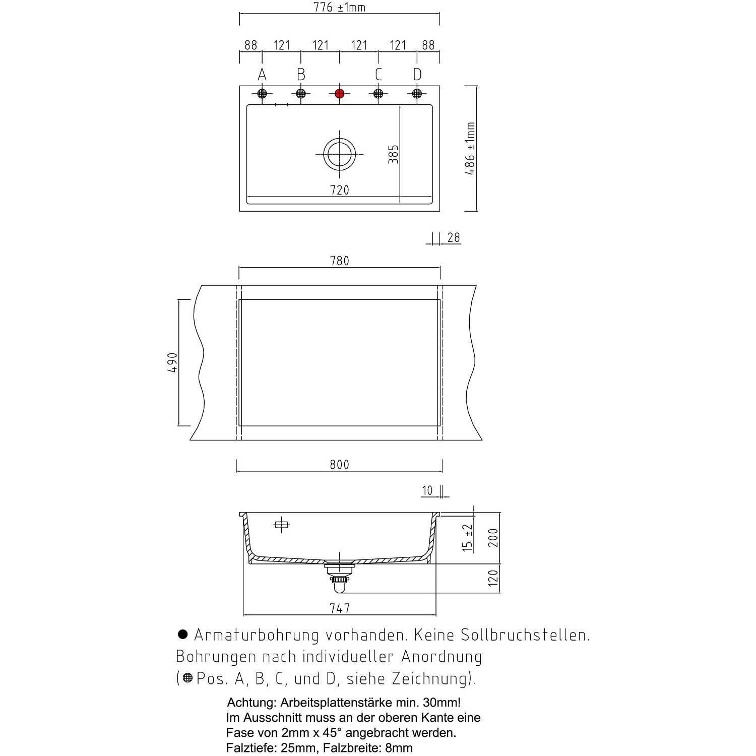 Für zusätzliche Bohrungen muss der entsprechende Artikel aus dem Zubehör zusätzlich mitbestellt werden. Informationen zu den Positionen der möglichen Hahnlöcher befinden sich in der Technischen Zeichnung