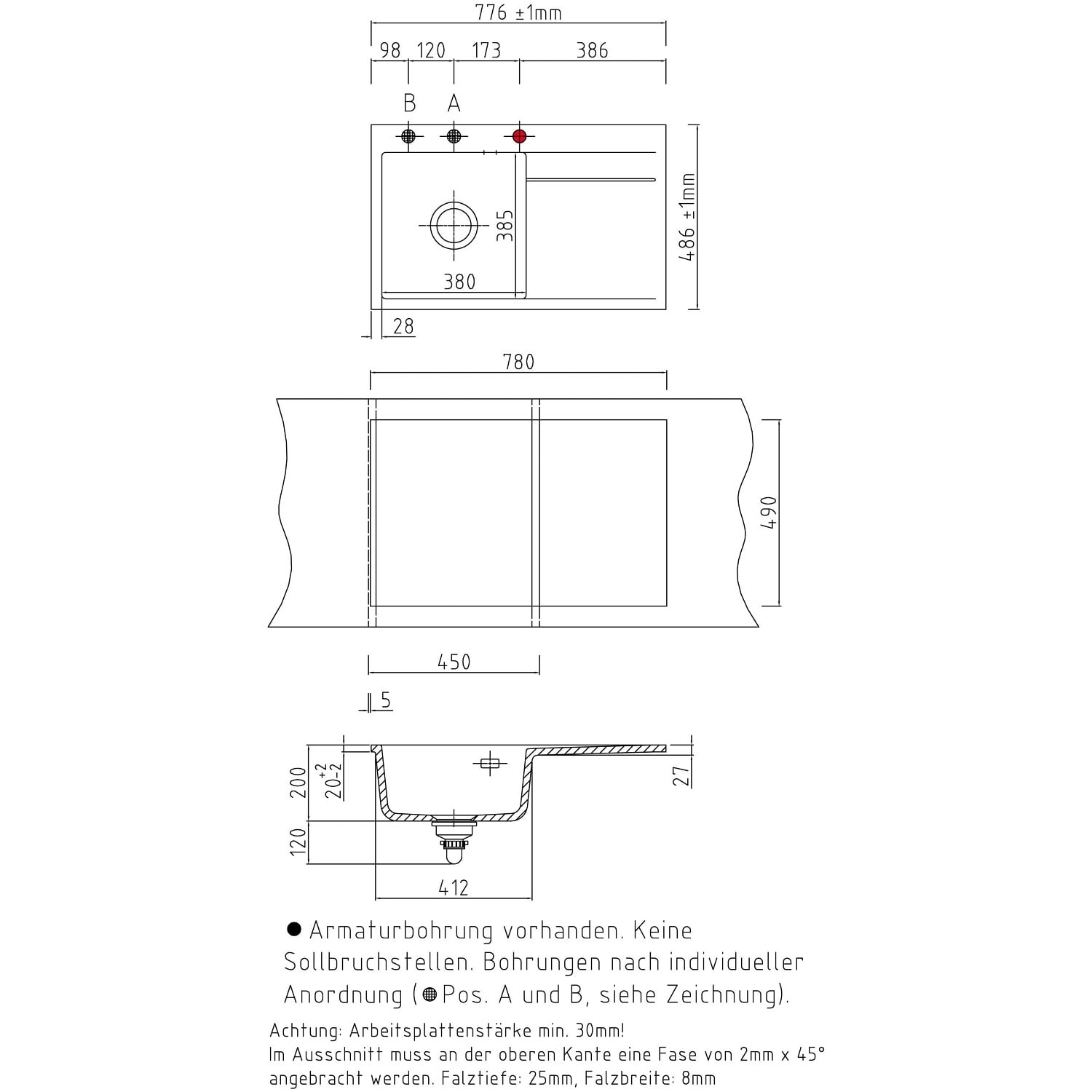 Für zusätzliche Bohrungen muss der entsprechende Artikel aus dem Zubehör zusätzlich mitbestellt werden. Informationen zu den Positionen der möglichen Hahnlöcher befinden sich in der Technischen Zeichnung