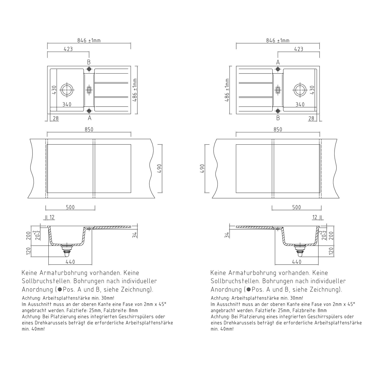 Für Hahnlochbohrungen muss der entsprechende Artikel aus dem Zubehör zusätzlich mitbestellt werden. Informationen zu den Positionen der möglichen Hahnlöcher befinden sich in der Technischen Zeichnung