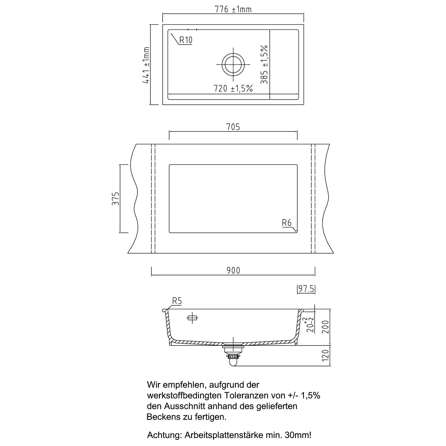 Es wird empfohlen aufgrund der Toleranz +/- 1,5%, den Ausschnitt anhand des gelieferten Beckens zu fertigen!