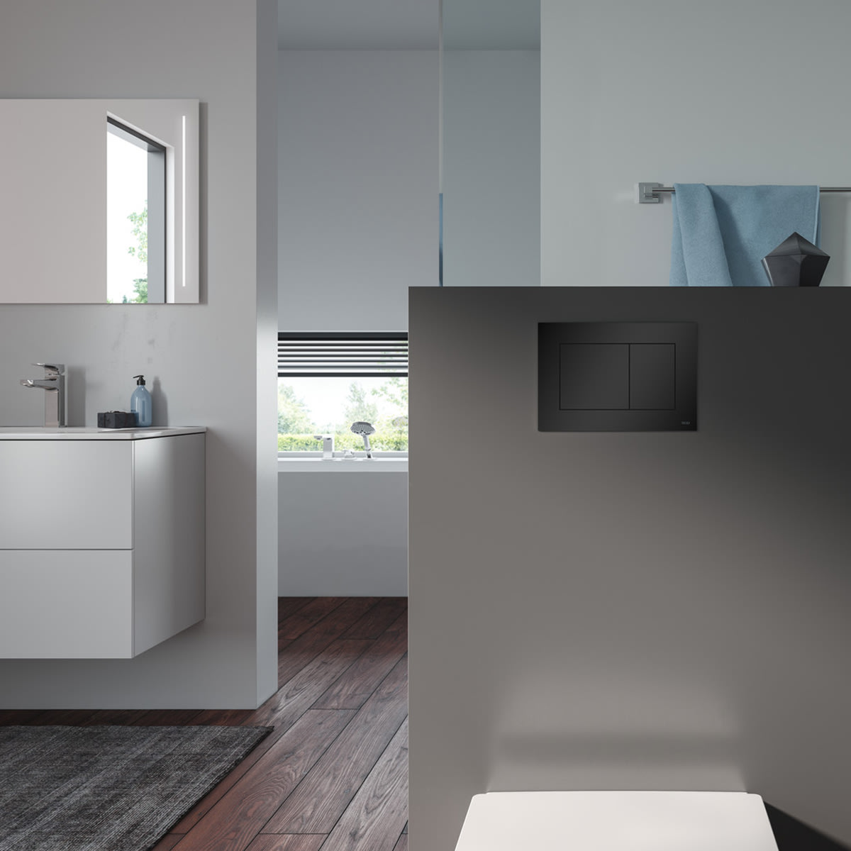 Setzen Sie optische Highlights oder schaffen Sie ein einheitliches Farbkonzept – in den Varianten Schwarz, Weiß und Chrom in glänzend oder matt bietet die TECEnow Betätigungsplatte vielfältige Gestaltungsmöglichkeiten.
