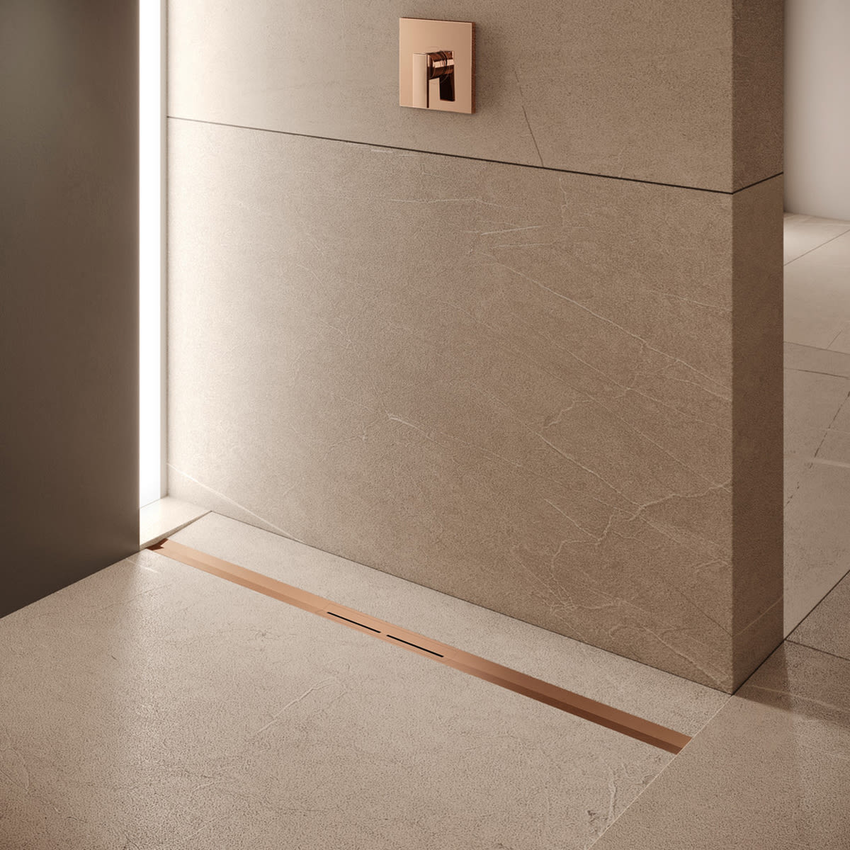 - Duschprofil zur Duschentwässerung, zum Einbau im Fliesenkleber oberhalb des Estrichs und der Abdichtung.