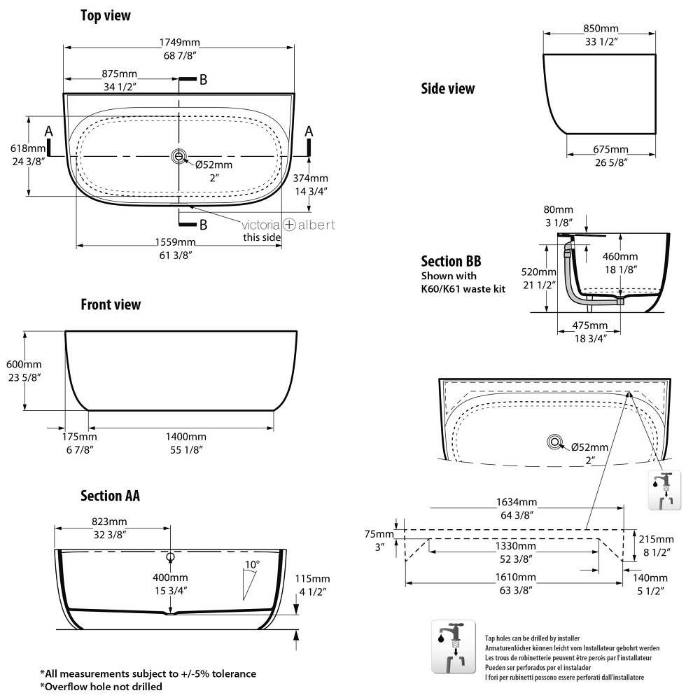 Ohne Löcher für Wannenrandarmaturen. Geeignet für freistehende oder an der Wand montierte Wanneneinläufe; oder für Messing Garnituren, für die speziell vor Ort Löcher gebohrt werden müssen.
