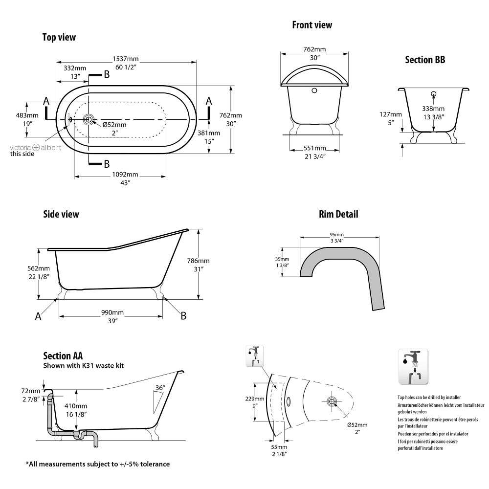 Ohne Löcher für Wannenrandarmaturen. Geeignet für freistehende oder an der Wand montierte Wanneneinläufe; Montage von Armaturen auf dem Wannenrand möglich, für die aber vor Ort Löcher gebohrt werden müssen.