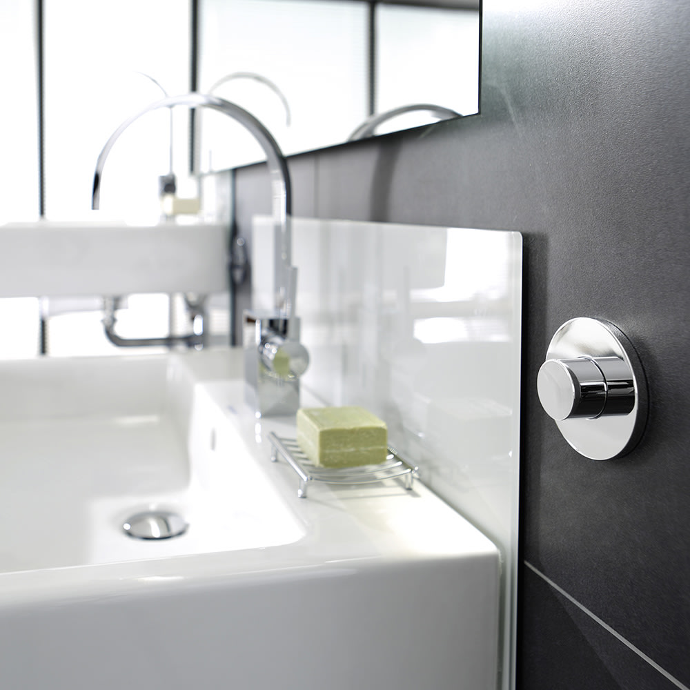 - mit Druckknopf mit Rosette zur individuellen Höheneinstellung der Waschtisch-Keramik
