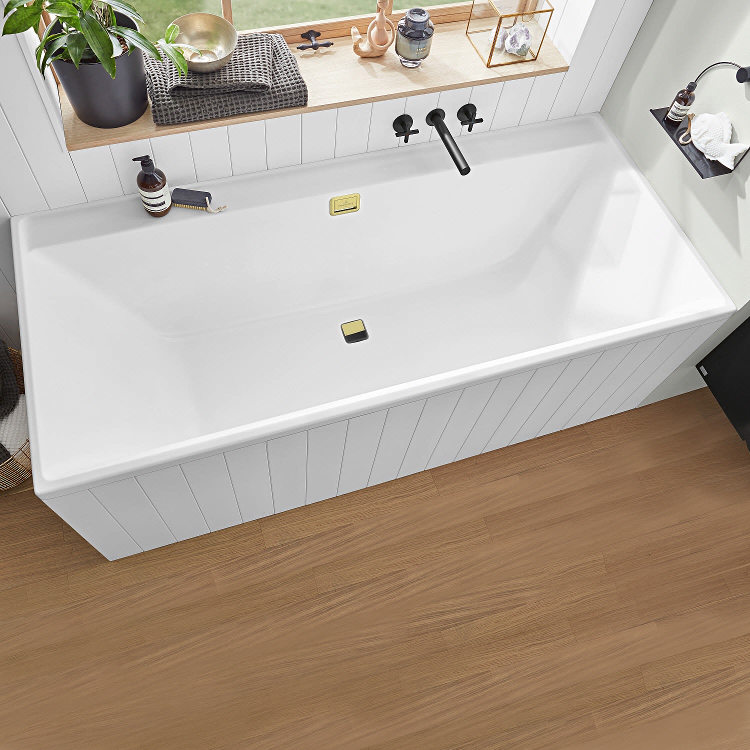 Die Kollektion Collaro von Villeroy & Boch bietet Liebhabern des minimalistischen Badezimmerstils eine edle Einbau-Badewanne mit feinen, schmalen Kanten. Als Design-Highlights der geradlinigen Wanne glänzen ein Schlitzüberlauf sowie ein mittig platzierter Ablauf für bequemen Sitzkomfort. In Kombination mit zwei ergonomischen Rückenschrägen wird so im großen Innenbecken entspannendes Baden für bis zu zwei Personen möglich. Die rechteckige Badewanne überzeugt zudem mit einem längsseitig breiten Rand, der besonders praktisch für Pflegeprodukte oder ein paar Kerzen ist. Aus bruchfestem und farbbeständigem Sanitäracryl gefertigt, zeichnet sich die Wanne durch eine hautsympathische Haptik und eine rutschfeste, pflegeleichte Oberfläche aus.