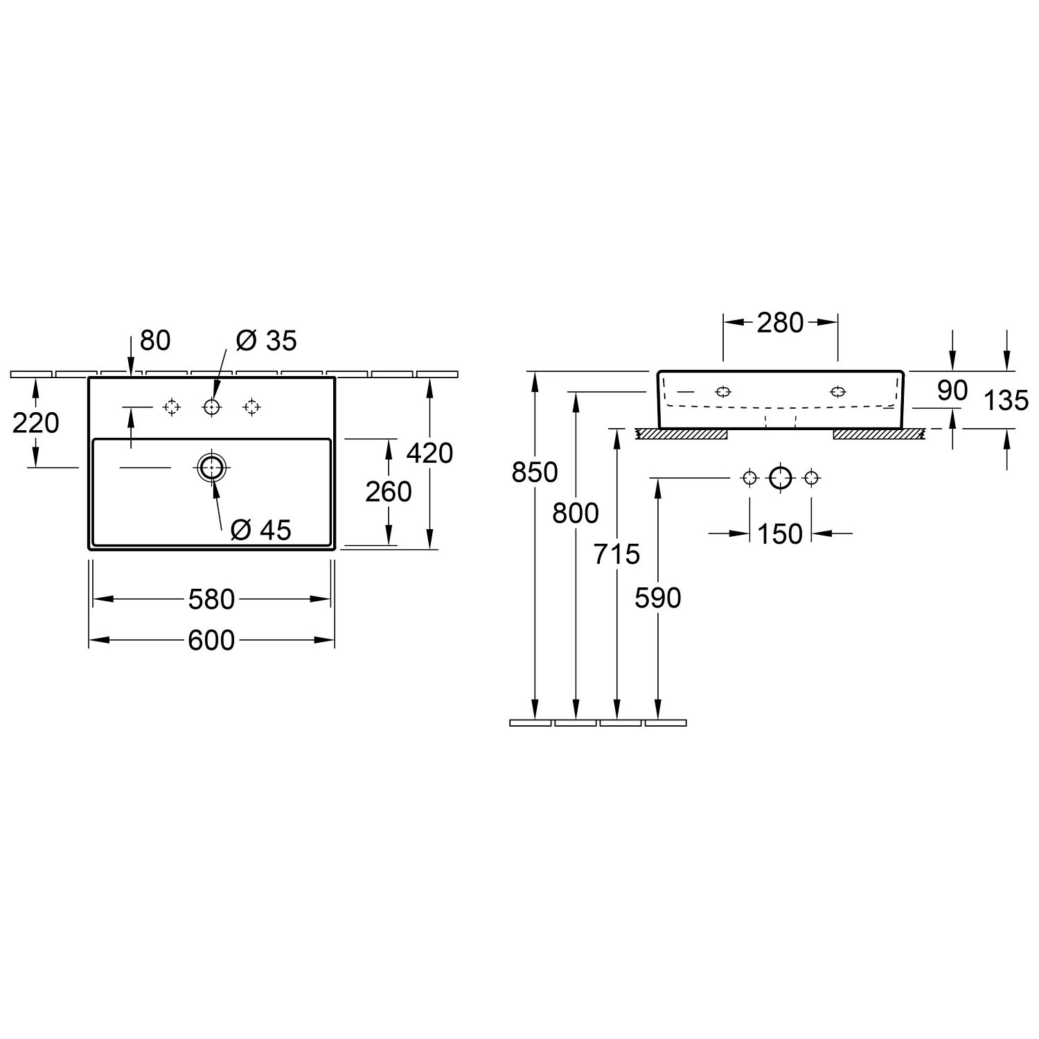 Villeroy & Boch Memento 2.0 Waschtisch 60 cm mit 1 Hahnloch, ohne Überlauf