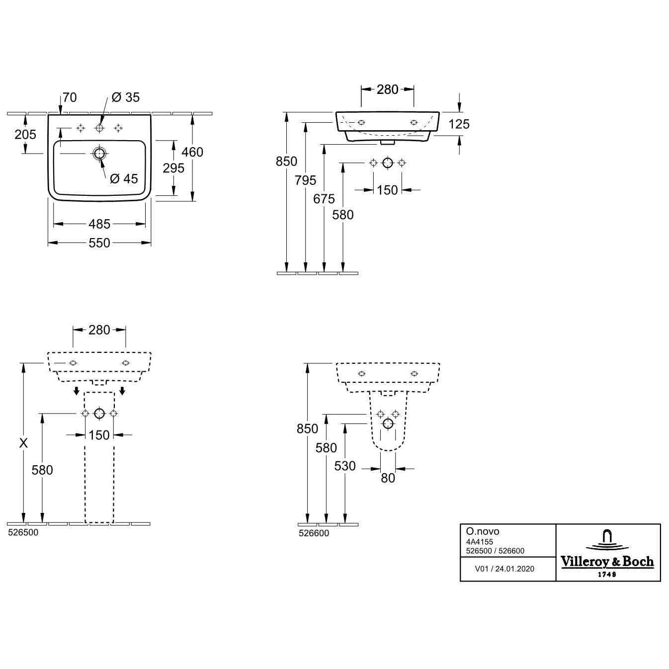 Villeroy & Boch O.novo Waschtisch 55 x 46 cm mit Überlauf, ohne Hahnloch