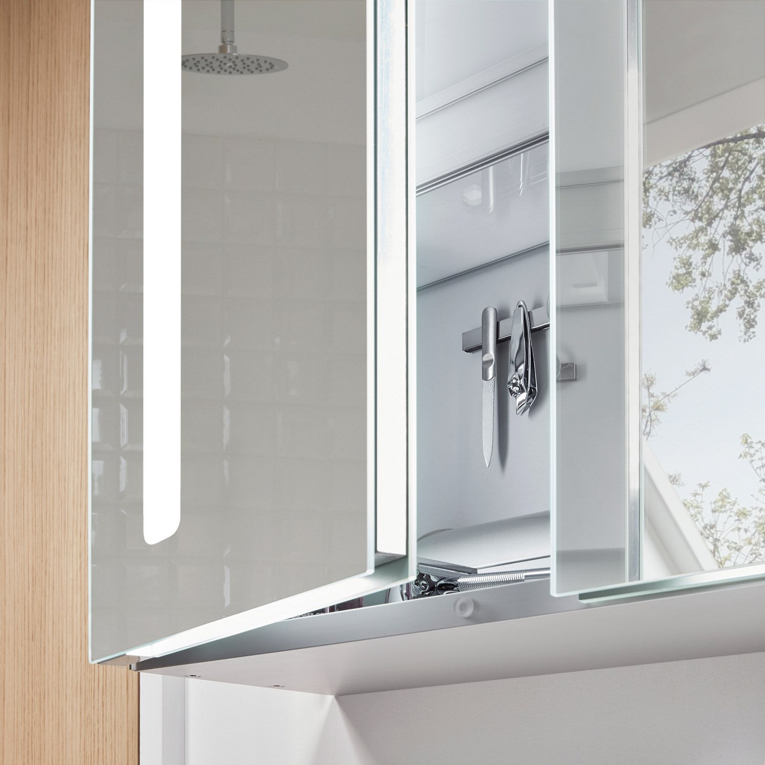 Der Spiegelschrank My View 14 von Villeroy & Boch eröffnet neue Spielräume für das Baddesign. Mit seinem rundum verspiegelten Aluminium-Korpus vergrößert er den Raum optisch und ist dabei ein stilvolles Gestaltungselement. Die energiesparende LED-Beleuchtung sorgt für eine optimale Ausleuchtung und eine individuelle Lichtstimmung im Badezimmer. Sie kann zwischen Warmweiß und Kaltweiß gewechselt werden und ist in drei Stufen dimmbar. Überzeugen Sie sich auch von der praktischen Innenausstattung wie Vergrößerungsspiegel, Ablageschale, Steckdose und Magnetleiste.