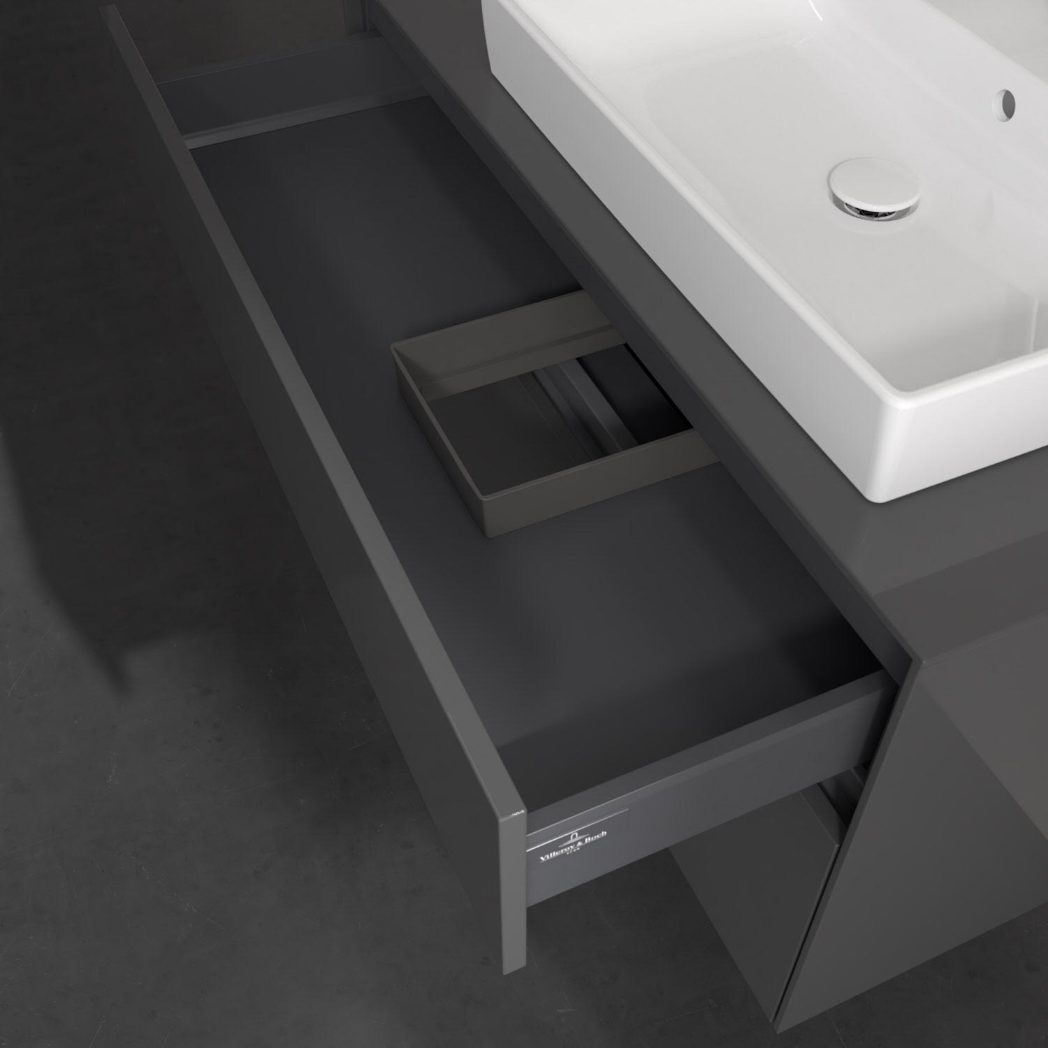 Stauraumwunder im zeitgemäßen Design: Der Villeroy & Boch Waschbeckenunterschrank aus der Collaro Kollektion eignet sich besonders für Familienbäder und bietet genau den Platz, der dort benötigt wird. Eine integrierte Griffleiste sorgt für eine schlichte, moderne Front. Im Inneren bietet das Möbelstück mit vier Auszügen erstaunlich viel Komfort – ermöglicht durch großzügiges Platzangebot und integrierte Antirutschmatten. Variabel setzbare Glasabtrennungen und mitgelieferte Accessory Boxen sorgen für den nötigen Überblick. Dank SoftClosing und Selbsteinzug lassen sich die Auszüge nach der Nutzung lautlos schließen.