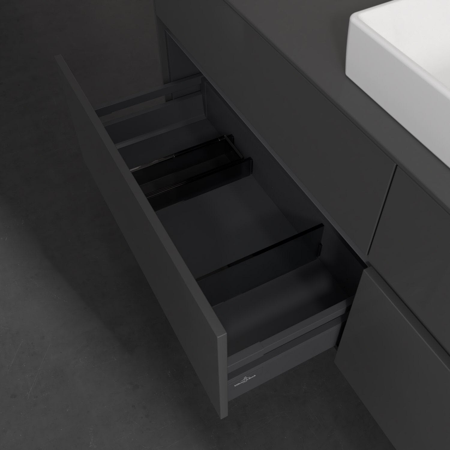 Stauraumwunder im zeitgemäßen Design: Der Villeroy & Boch Waschbeckenunterschrank aus der Collaro Kollektion eignet sich besonders für Familienbäder und bietet genau den Platz, der dort benötigt wird. Eine integrierte Griffleiste sorgt für eine schlichte, moderne Front. Im Inneren bietet das Möbelstück mit vier Auszügen erstaunlich viel Komfort – ermöglicht durch großzügiges Platzangebot und integrierte Antirutschmatten. Variabel setzbare Glasabtrennungen und mitgelieferte Accessory Boxen sorgen für den nötigen Überblick. Dank SoftClosing und Selbsteinzug lassen sich die Auszüge nach der Nutzung lautlos schließen.
