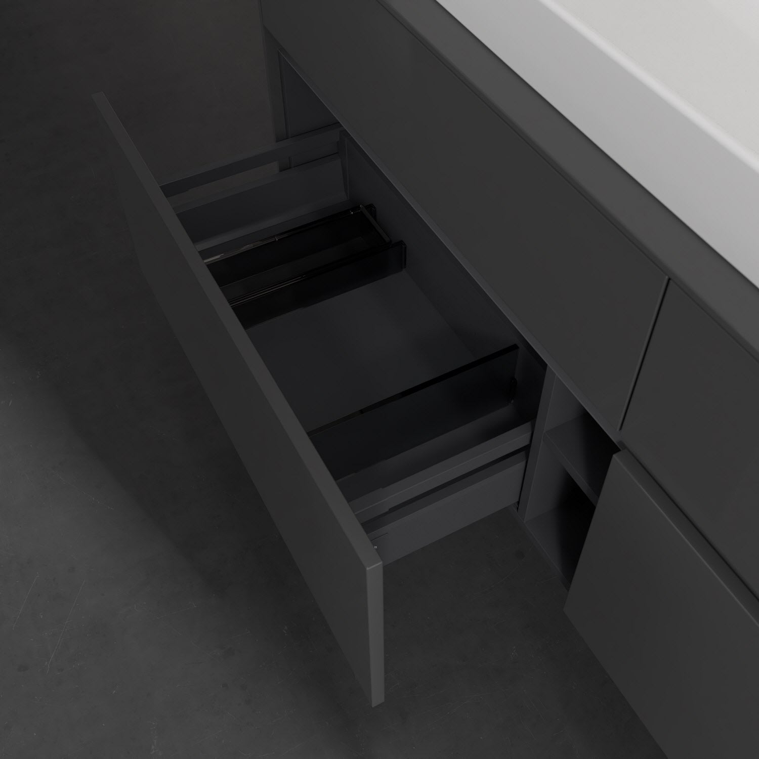 - kein Umfallen oder Verrutschen von Pflegeprodukten in den Schubladen dank rutschhemmendem Boden