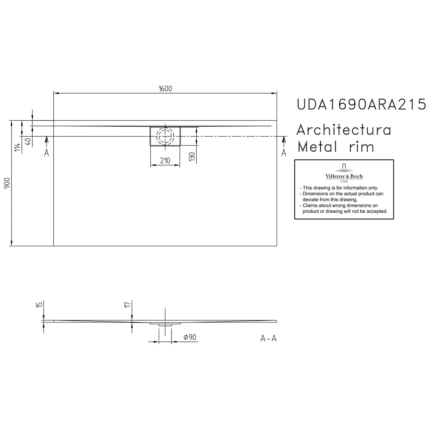 Villeroy & Boch Architectura Metalrim Duschwanne 160 x 90 x 1,5 cm