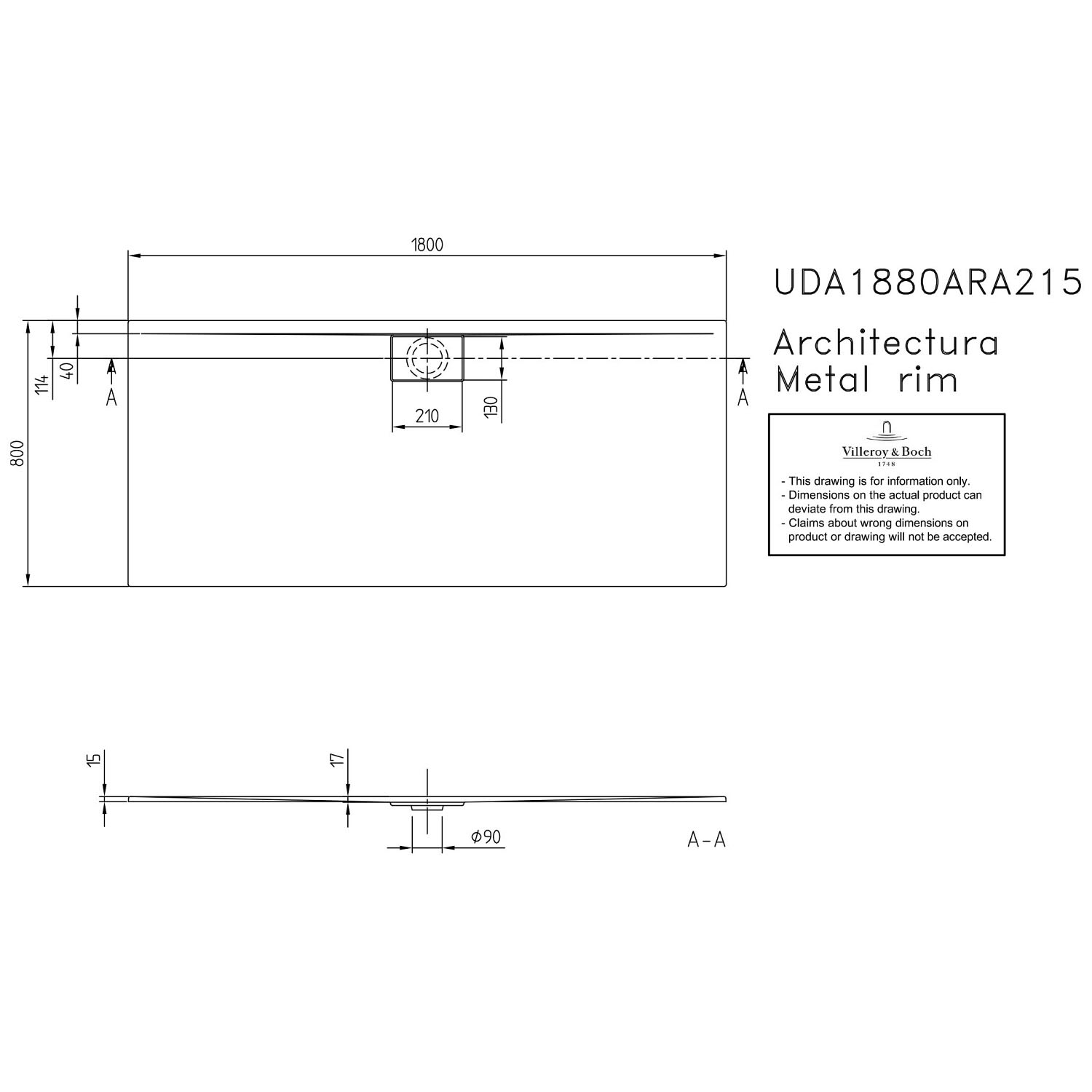 Villeroy & Boch Architectura Metalrim Duschwanne 180 x 80 x 1,5 cm