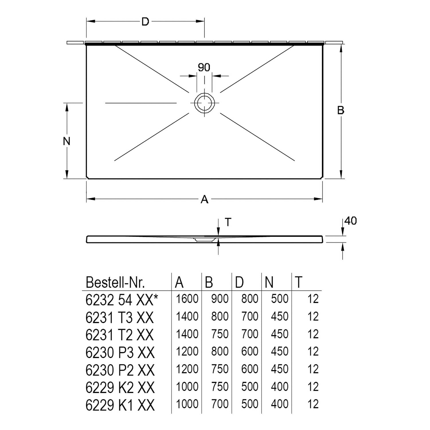 - Ablauf mittig mit Ø: 9 cm