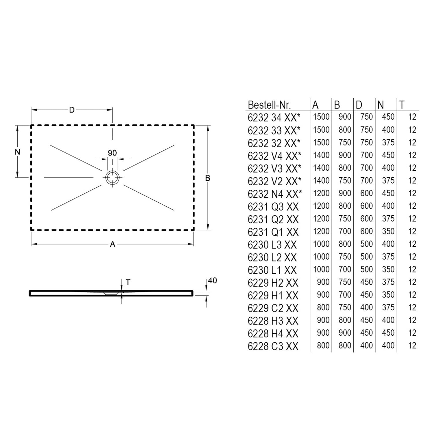 - Ablauf mittig mit Ø: 9 cm