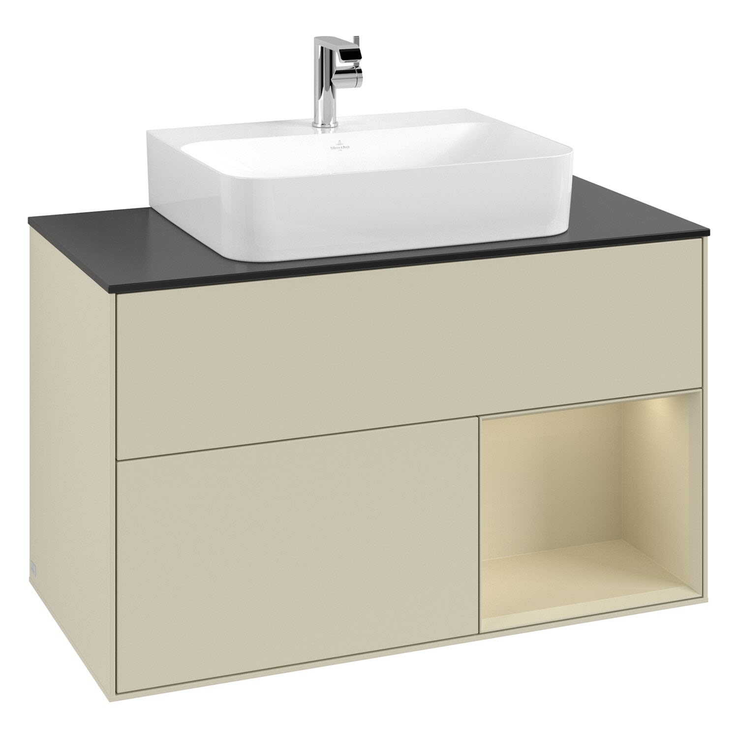 Villeroy & Boch Finion Waschtischunterschrank 100 cm mit Regalelement rechts, Abdeckplatte, Wandbeleuchtung